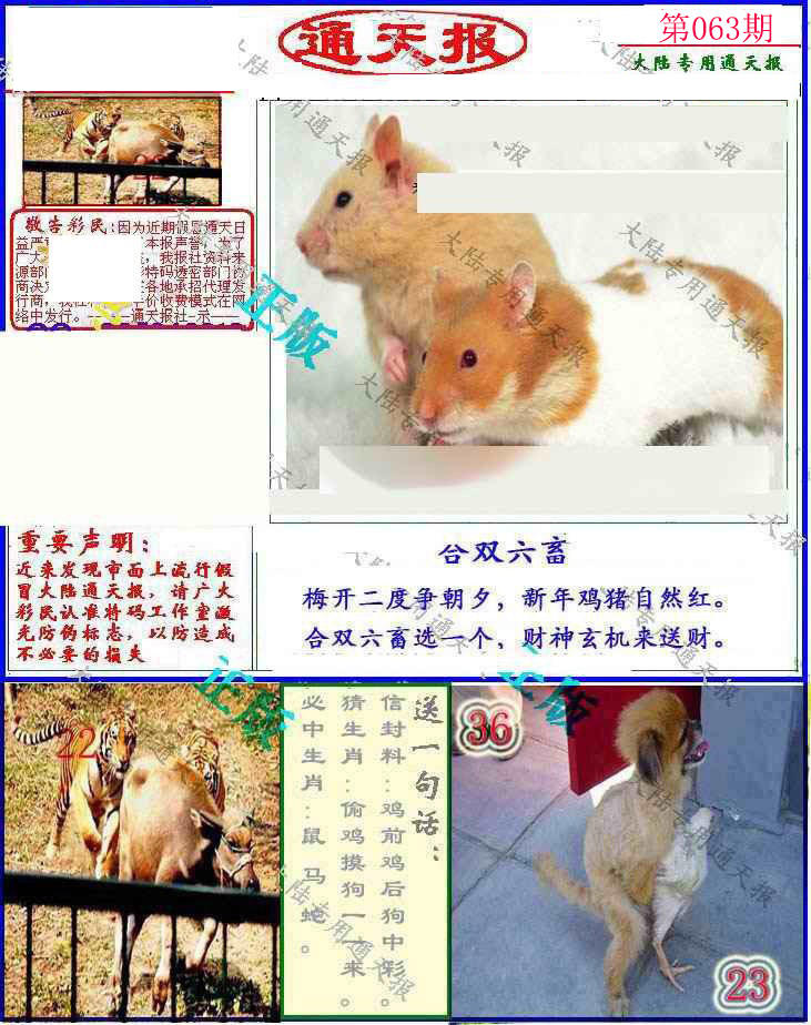 | 063期【鸡鼠狗兔虎羊】开: 鼠 19 |
